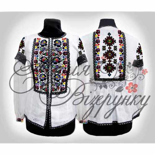В комплект заготовки модельной женской сорочки под вышивку входит домотканное полотно с нанесенным цветным рисунком-схемой, состоящее из отрезов: два рукава (75х65см), передняя часть (75х75см), спинка (75х65см), кокетка, манжеты, воротничок и инструкция.