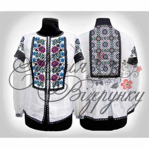 В комплект заготовки модельной женской сорочки под вышивку входит домотканное полотно с нанесенным цветным рисунком-схемой, состоящее из отрезов: два рукава (75х65см), передняя часть (75х75см), спинка (75х65см), кокетка, манжеты, воротничок и инструкция.