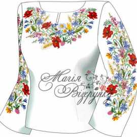 В комплект заготовки женской вышиванки входит 4 отреза домотканного полотна с нанесенной цветной схемой-орнаментом: два рукава (75х65см), передняя часть и спинка (75х75см). Комплектуется инструкцией с указанием количества бисера и номеров мулине DMC.