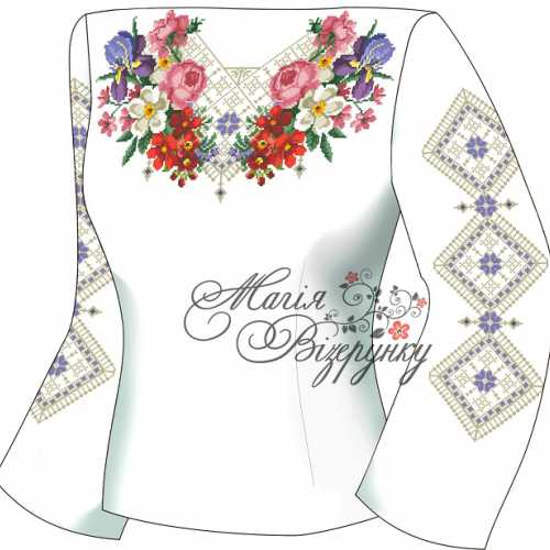 В комплект заготовки женской вышиванки входит 4 отреза домотканного полотна с нанесенной цветной схемой-орнаментом: два рукава (75х65см), передняя часть и спинка (75х75см). Комплектуется инструкцией с указанием количества бисера и номеров мулине DMC.