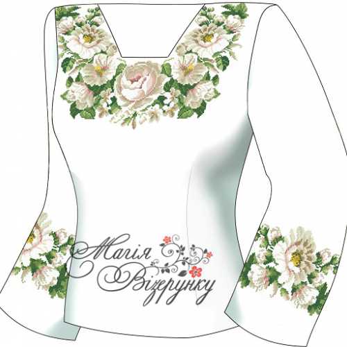 В комплект заготовки женской вышиванки входит 4 отреза домотканного полотна с нанесенной цветной схемой-орнаментом: два рукава (75х65см), передняя часть и спинка (75х75см). Комплектуется инструкцией с указанием количества бисера и номеров мулине DMC.
