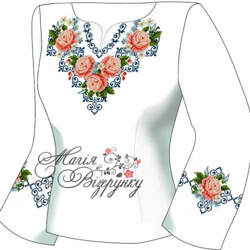 В комплект заготовки женской вышиванки входит 4 отреза домотканного полотна с нанесенной цветной схемой-орнаментом: два рукава (75х65см), передняя часть и спинка (75х75см). Комплектуется инструкцией с указанием количества бисера и номеров мулине DMC.