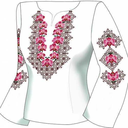 В комплект заготовки женской вышиванки входит 4 отреза домотканного полотна с нанесенной цветной схемой-орнаментом: два рукава (75х65см), передняя часть и спинка (75х75см). Комплектуется инструкцией с указанием количества бисера и номеров мулине DMC.