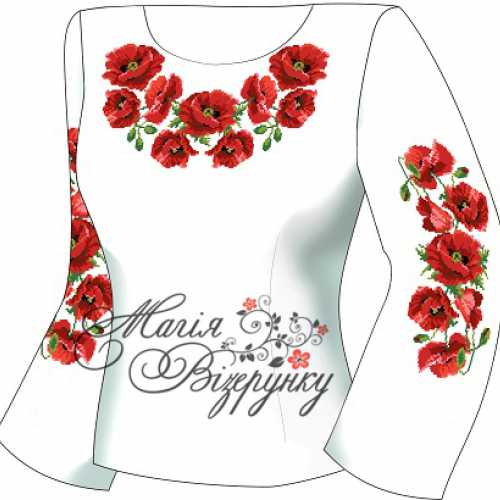 В комплект заготовки женской вышиванки входит 4 отреза домотканного полотна с нанесенной цветной схемой-орнаментом: два рукава (75х65см), передняя часть и спинка (75х75см). Комплектуется инструкцией с указанием количества бисера и номеров мулине DMC.