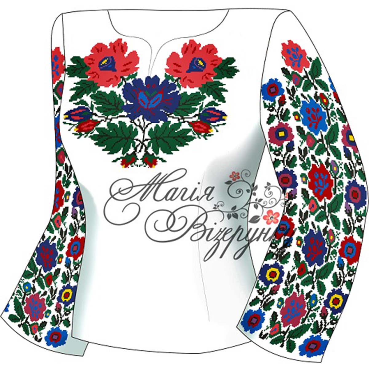 В комплект заготовки женской вышиванки входит 4 отреза домотканного полотна с нанесенной цветной схемой-орнаментом: два рукава (75х65см), передняя часть и спинка (75х75см). Комплектуется инструкцией с указанием количества бисера и номеров мулине DMC.