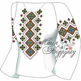 В комплект заготовки женской вышиванки входит 4 отреза домотканного полотна с нанесенной цветной схемой-орнаментом: два рукава (75х65см), передняя часть и спинка (75х75см). Комплектуется инструкцией с указанием количества бисера и номеров мулине DMC.