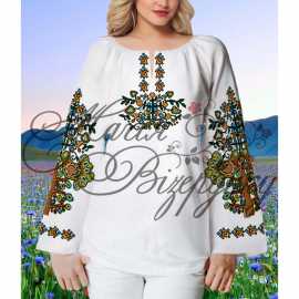 В комплект заготовки женской вышиванки входит 4 отреза домотканного полотна с нанесенной цветной схемой-орнаментом: два рукава (75х65см), передняя часть и спинка (75х75см). Комплектуется инструкцией с указанием количества бисера и номеров мулине DMC.