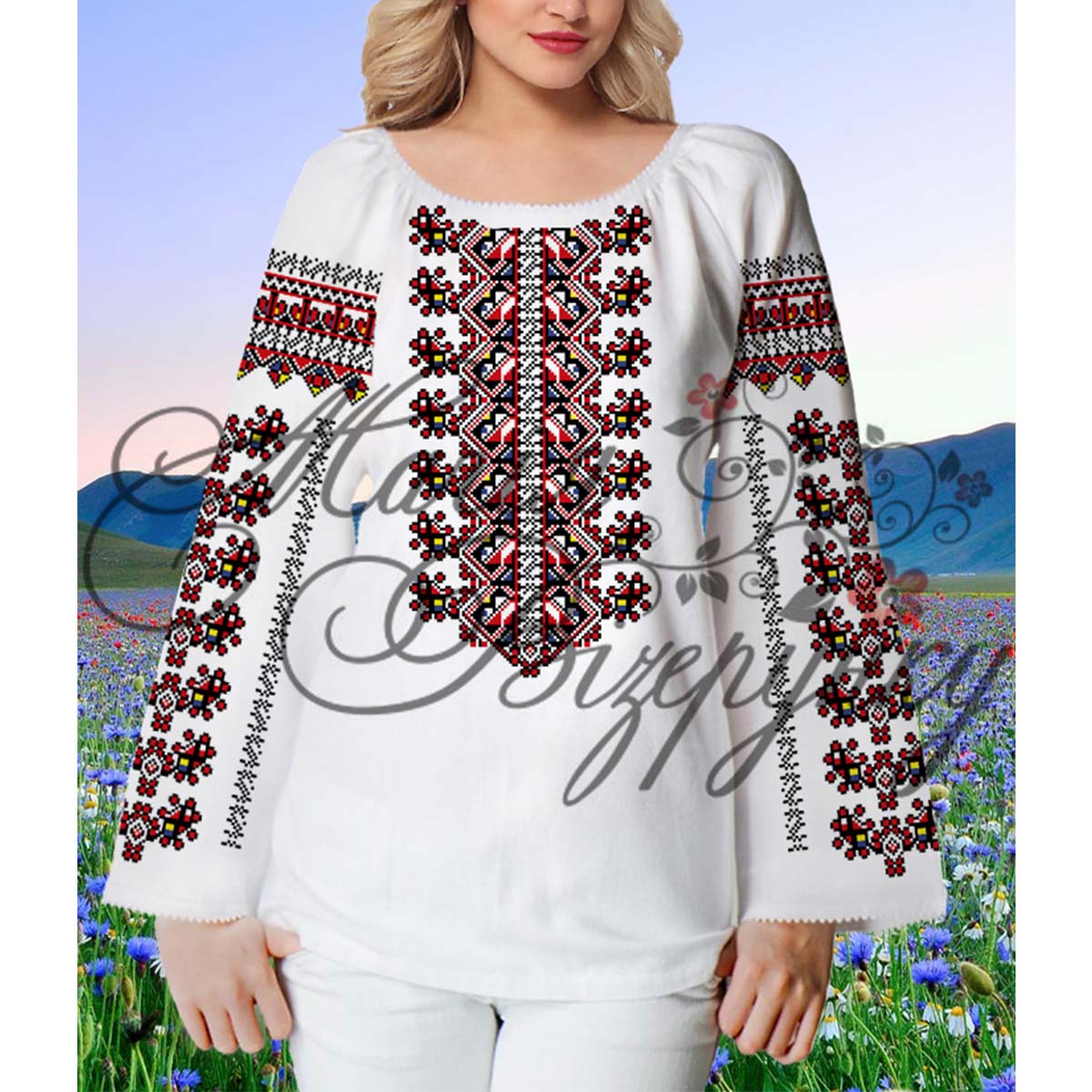 В комплект заготовки женской вышиванки входит 4 отреза домотканного полотна с нанесенной цветной схемой-орнаментом: два рукава (75х65см), передняя часть и спинка (75х75см). Комплектуется инструкцией с указанием количества бисера и номеров мулине DMC.
