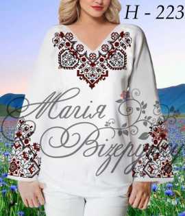 В комплект заготовки женской вышиванки входит 4 отреза домотканного полотна с нанесенной цветной схемой-орнаментом: два рукава (75х65см), передняя часть и спинка (75х75см). Комплектуется инструкцией с указанием количества бисера и номеров мулине DMC.