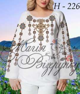 В комплект заготовки женской вышиванки входит 4 отреза домотканного полотна с нанесенной цветной схемой-орнаментом: два рукава (75х65см), передняя часть и спинка (75х75см). Комплектуется инструкцией с указанием количества бисера и номеров мулине DMC.