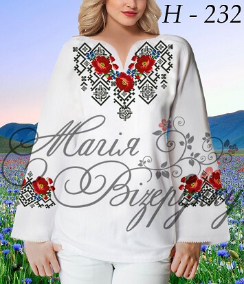 В комплект заготовки женской вышиванки входит 4 отреза домотканного полотна с нанесенной цветной схемой-орнаментом: два рукава (75х65см), передняя часть и спинка (75х75см). Комплектуется инструкцией с указанием количества бисера и номеров мулине DMC.