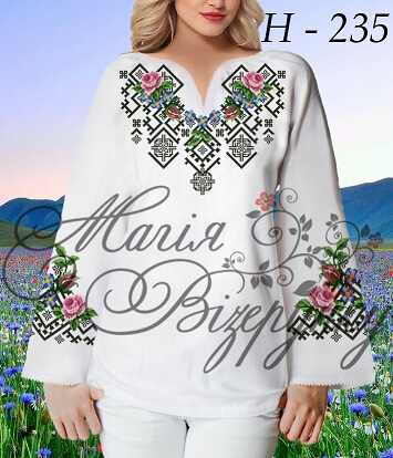 В комплект заготовки женской вышиванки входит 4 отреза домотканного полотна с нанесенной цветной схемой-орнаментом: два рукава (75х65см), передняя часть и спинка (75х75см). Комплектуется инструкцией с указанием количества бисера и номеров мулине DMC.