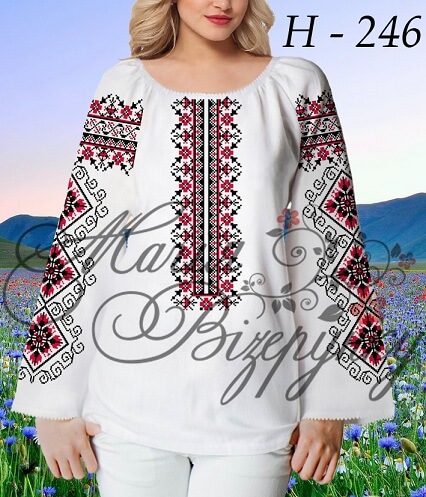 В комплект заготовки женской вышиванки входит 4 отреза домотканного полотна с нанесенной цветной схемой-орнаментом: два рукава (75х65см), передняя часть и спинка (75х75см). Комплектуется инструкцией с указанием количества бисера и номеров мулине DMC.