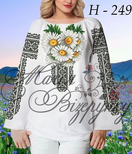 В комплект заготовки женской вышиванки входит 4 отреза домотканного полотна с нанесенной цветной схемой-орнаментом: два рукава (75х65см), передняя часть и спинка (75х75см). Комплектуется инструкцией с указанием количества бисера и номеров мулине DMC.