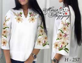 В комплект заготовки женской вышиванки входит 4 отреза домотканного полотна с нанесенной цветной схемой-орнаментом: два рукава (75х65см), передняя часть и спинка (75х75см). Комплектуется инструкцией с указанием количества бисера и номеров мулине DMC.