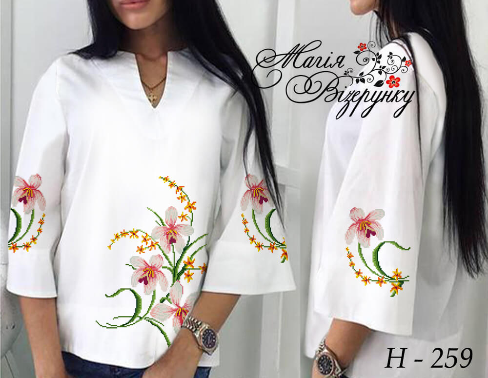 В комплект заготовки женской вышиванки входит 4 отреза домотканного полотна с нанесенной цветной схемой-орнаментом: два рукава (75х65см), передняя часть и спинка (75х75см). Комплектуется инструкцией с указанием количества бисера и номеров мулине DMC.