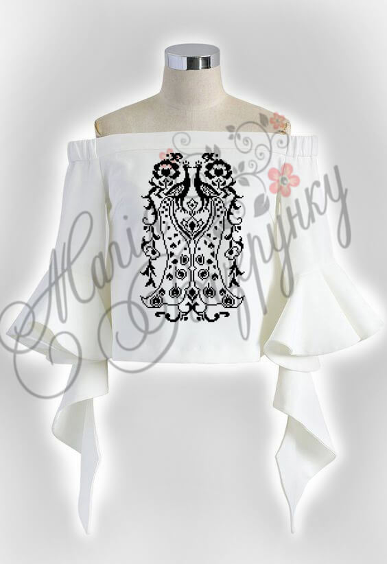 В комплект заготовки женской летней блузки входит 4 отреза домотканного полотна с нанесенной цветной схемой-орнаментом: два рукава (75х65см), передняя часть и спинка (75х75см). Комплектуется инструкцией с указанием количества бисера и номеров мулине DMC.