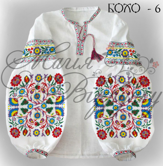 В комплект заготовки вышиванки в стиле БОХО входят отрезы домотканного полотна с нанесенной цветной схемой: 2 рукава, передняя часть и спинка (по 75х75см), манжеты и воротничок. Комплектуется инструкцией с указанием количества бисера и номеров мулине DMC.