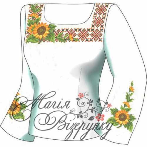 В комплект заготовки женской вышиванки входит 4 отреза домотканного полотна с нанесенной цветной схемой-орнаментом: два рукава (75х65см), передняя часть и спинка (75х75см). Комплектуется инструкцией с указанием количества бисера и номеров мулине DMC.