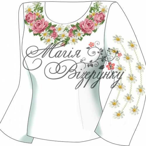 В комплект заготовки женской вышиванки входит 4 отреза домотканного полотна с нанесенной цветной схемой-орнаментом: два рукава (75х65см), передняя часть и спинка (75х75см). Комплектуется инструкцией с указанием количества бисера и номеров мулине DMC.