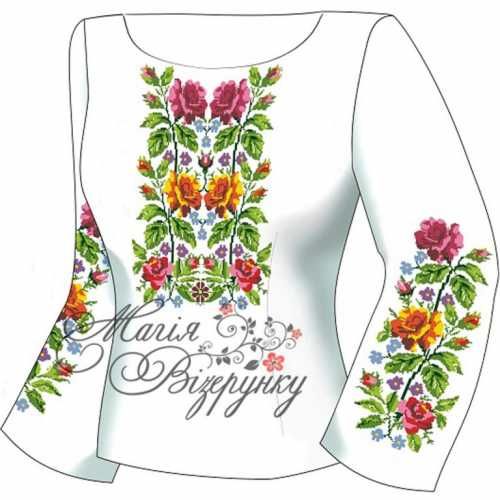 В комплект заготовки женской вышиванки входит 4 отреза домотканного полотна с нанесенной цветной схемой-орнаментом: два рукава (75х65см), передняя часть и спинка (75х75см). Комплектуется инструкцией с указанием количества бисера и номеров мулине DMC.