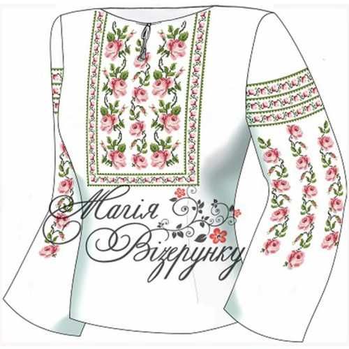 В комплект заготовки женской вышиванки входит 4 отреза домотканного полотна с нанесенной цветной схемой-орнаментом: два рукава (75х65см), передняя часть и спинка (75х75см). Комплектуется инструкцией с указанием количества бисера и номеров мулине DMC.