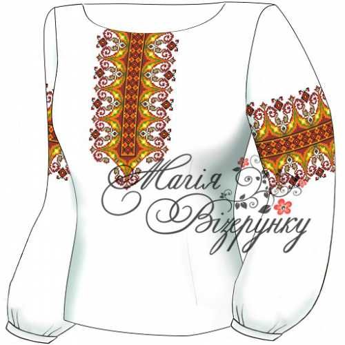 В комплект заготовки женской вышиванки входит 4 отреза домотканного полотна с нанесенной цветной схемой-орнаментом: два рукава (75х65см), передняя часть и спинка (75х75см). Комплектуется инструкцией с указанием количества бисера и номеров мулине DMC.