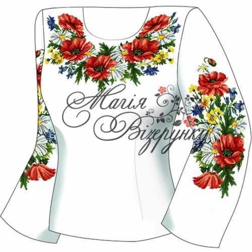 В комплект заготовки женской вышиванки входит 4 отреза домотканного полотна с нанесенной цветной схемой-орнаментом: два рукава (75х65см), передняя часть и спинка (75х75см). Комплектуется инструкцией с указанием количества бисера и номеров мулине DMC.