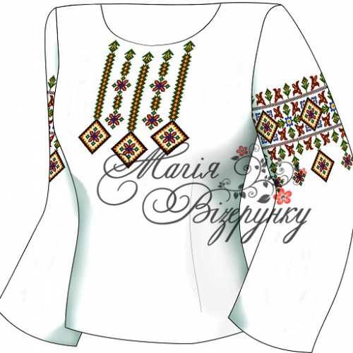 В комплект заготовки женской вышиванки входит 4 отреза домотканного полотна с нанесенной цветной схемой-орнаментом: два рукава (75х65см), передняя часть и спинка (75х75см). Комплектуется инструкцией с указанием количества бисера и номеров мулине DMC.