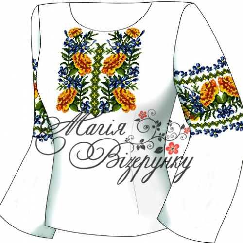 В комплект заготовки женской вышиванки входит 4 отреза домотканного полотна с нанесенной цветной схемой-орнаментом: два рукава (75х65см), передняя часть и спинка (75х75см). Комплектуется инструкцией с указанием количества бисера и номеров мулине DMC.