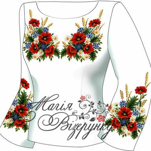 В комплект заготовки женской вышиванки входит 4 отреза домотканного полотна с нанесенной цветной схемой-орнаментом: два рукава (75х65см), передняя часть и спинка (75х75см). Комплектуется инструкцией с указанием количества бисера и номеров мулине DMC.