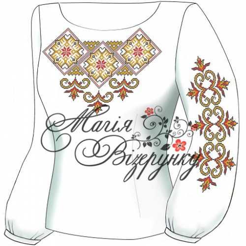 В комплект заготовки женской вышиванки входит 4 отреза домотканного полотна с нанесенной цветной схемой-орнаментом: два рукава (75х65см), передняя часть и спинка (75х75см). Комплектуется инструкцией с указанием количества бисера и номеров мулине DMC.