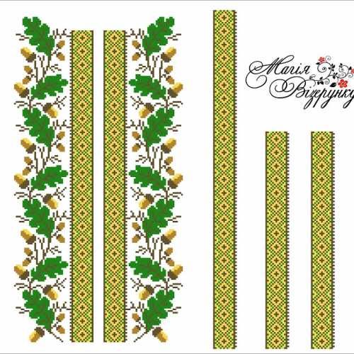 В комплект заготовки мужской вышиванки входит 4 отреза домотканного полотна (по 75х80см) с нанесенной цветной схемой-орнаментом на рукава, переднюю часть и спинку, манжеты и воротничок и инструкция с указанием количества бисера и номеров мулине DMC.