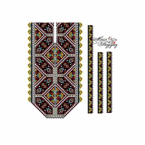 В комплект заготовки мужской вышиванки входит 4 отреза домотканного полотна (по 75х80см) с нанесенной цветной схемой-орнаментом на рукава, переднюю часть и спинку, манжеты и воротничок и инструкция с указанием количества бисера и номеров мулине DMC.