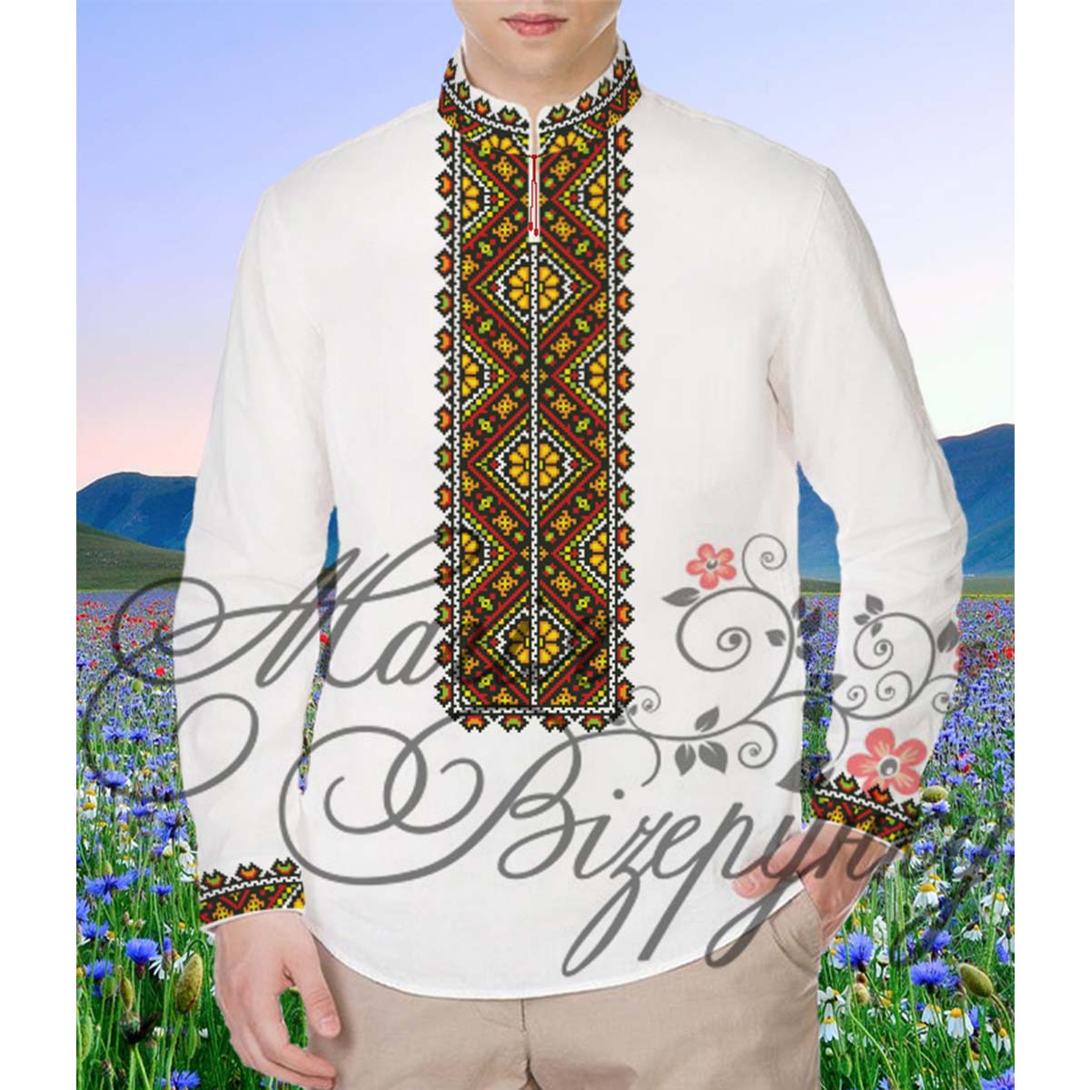 В комплект заготовки мужской вышиванки входит 4 отреза домотканного полотна (по 75х80см) с нанесенной цветной схемой-орнаментом на рукава, переднюю часть и спинку, манжеты и воротничок и инструкция с указанием количества бисера и номеров мулине DMC.