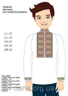 Сорочка для вышивки бисером DANA арт. 95 состоит из четырех отрезов ткани (габардин) с нанесенным рисунком: спинка и перед 85х85см, рукава 65х85см. Также в комплект входит флизелин. Сорочку рекомендуется вышивать бисером Preciosa.