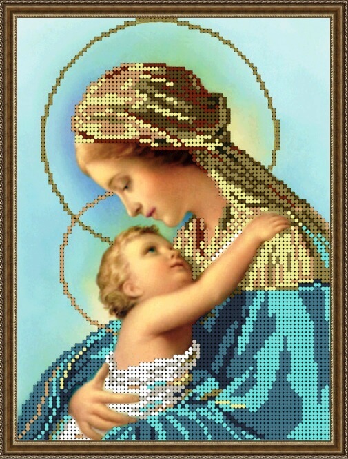 Схема для вышивки бисером Богородица Дева Мария с Иисусом ТМ I.B.Studio выполнена на габардине, бродублированном флизелином и с прооверлоченными краями. Формат А4. Количество цветов бисера - 11.