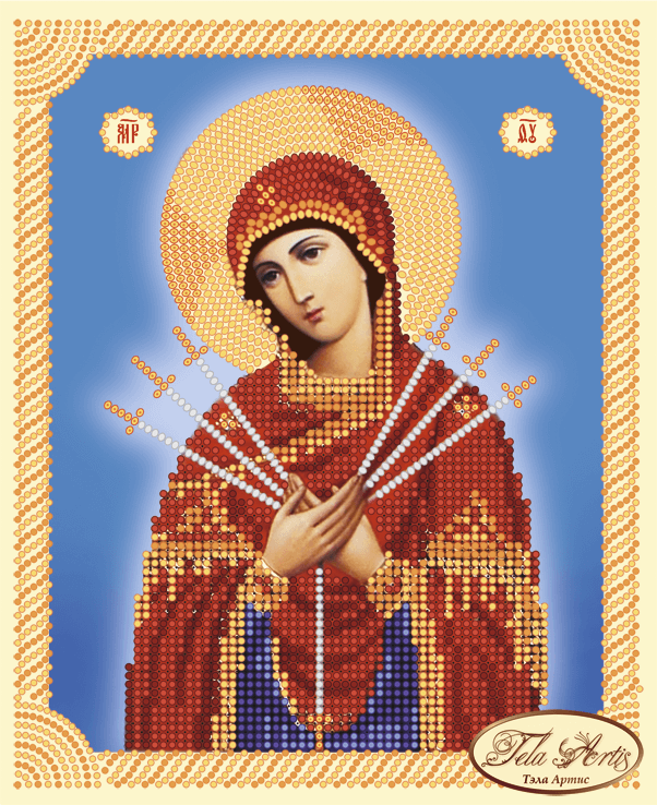 Схема для вышивки бисером Божья Матерь Семистрельная выполнена на плотном атласе, продублированном флизелином. Края всех схем Тэла Артис запаяны и не сыпятся в процессе вышивания. На схеме указаны количество и рекомендуемые цвета бисера Preciosa.