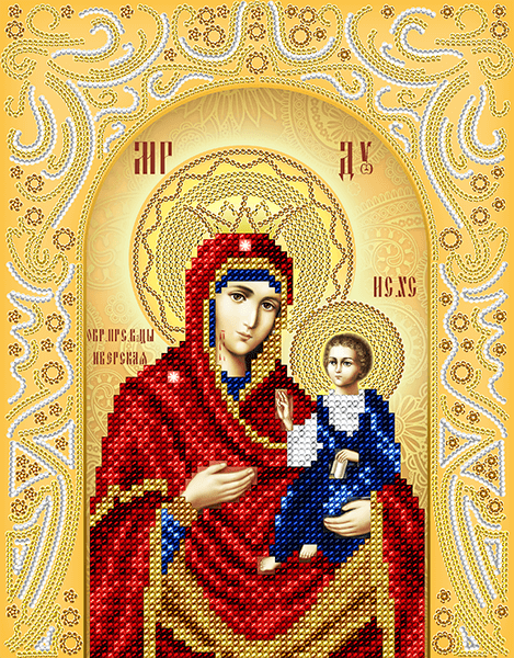 Схема для вышивания бисером Иверская Икона Божией Матери ТМ А-строчка выполнена из плотного атласа с нанесением яркой полноцветной печати высококачественными красками и содержит инструкцию.