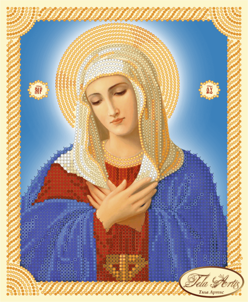 Схема для вышивки бисером Икона Божией Матери "Умиление" выполнена на плотном атласе, продублированном флизелином. Края всех схем Тэла Артис запаяны и не сыпятся в процессе вышивания. На схеме указаны количество и рекомендуемые цвета бисера Preciosa.