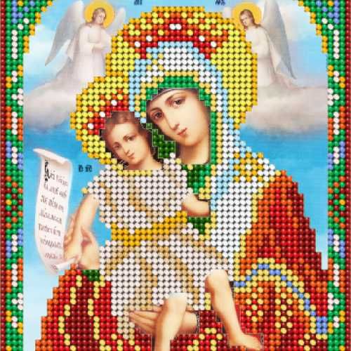 Схема для вышивания бисером Икона Божией Матери Достойно есть (Милующая) компании А-строчка выполнена из плотного атласа с нанесением яркой полноцветной печати высококачественными красками и содержит инструкцию.