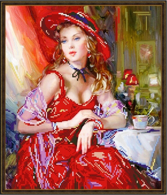 Схема для вышивки бисером Дама в красном платье ТМ I.B.Studio выполнена на габардине, бродублированном флизелином и с прооверлоченными краями. Формат А3. Количество цветов бисера - 13.