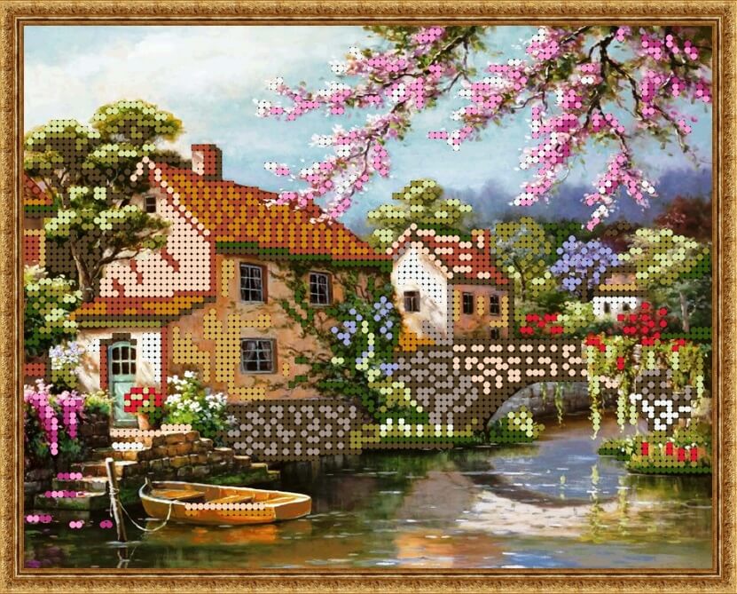 Схема для вышивки бисером Домик у реки ТМ I.B.Studio выполнена на габардине, бродублированном флизелином и с прооверлоченными краями. Формат А4. Количество цветов бисера - 14.