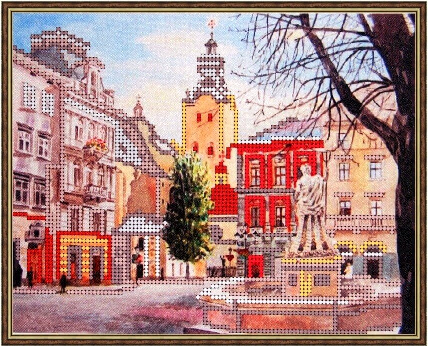 Схема для вышивки бисером Летняя Площадь Рынок ТМ I.B.Studio выполнена на габардине, бродублированном флизелином и с прооверлоченными краями. Формат А4. Количество цветов бисера - 7.