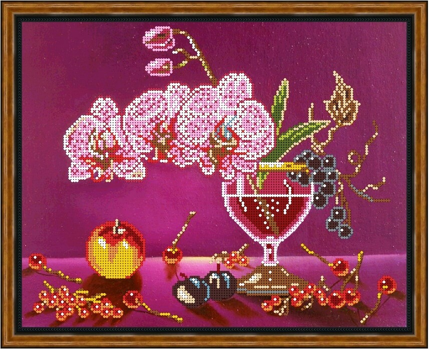 Схема для вышивки бисером Орхидея в бокале ТМ I.B.Studio выполнена на габардине, бродублированном флизелином и с прооверлоченными краями. Формат А3. Количество цветов бисера - 14.