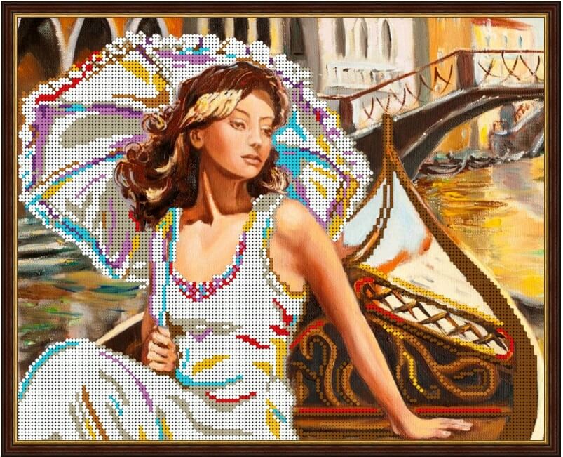 Схема для вышивки бисером Под зонтиком в Венеции ТМ I.B.Studio выполнена на габардине, бродублированном флизелином и с прооверлоченными краями. Формат А3. Количество цветов бисера - 9.