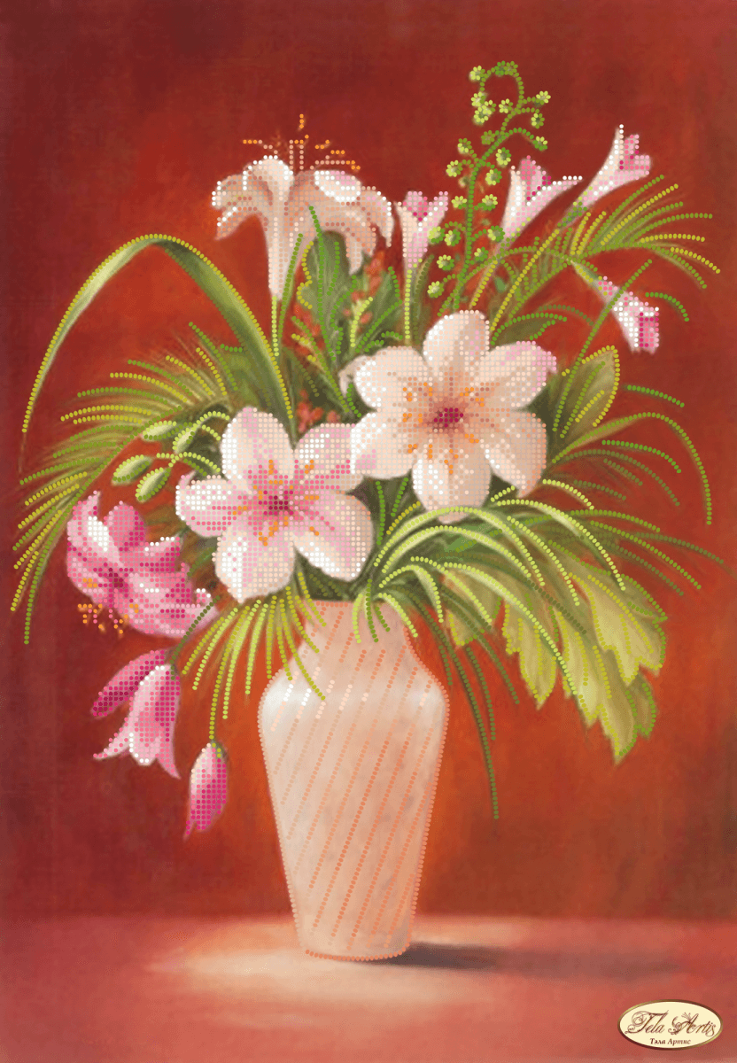 Схема для вышивания бисером Букет лилий выполнена на плотном атласе, продублированном флизелином. Края всех схем Тэла Артис запаяны и не сыпятся в процессе вышивания. На схеме указаны количество и рекомендуемые цвета бисера Preciosa.