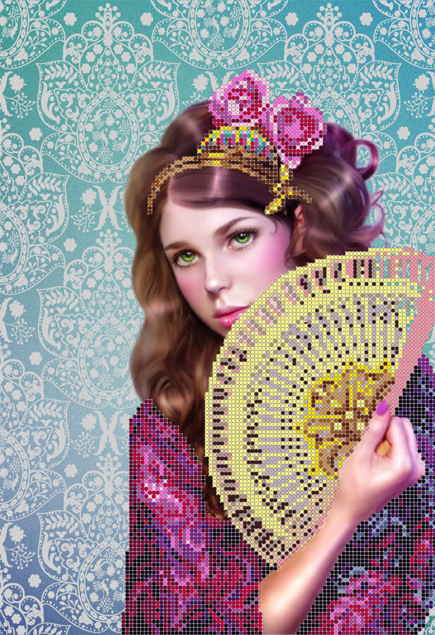Схема для вышивки бисером Девушка с веером ТМ Картины Бисером выполнена на высококачественном габардине. Каждая схема комплектуется инструкцией и картой рекомендованных цветов с указанием количества и веса бисера.