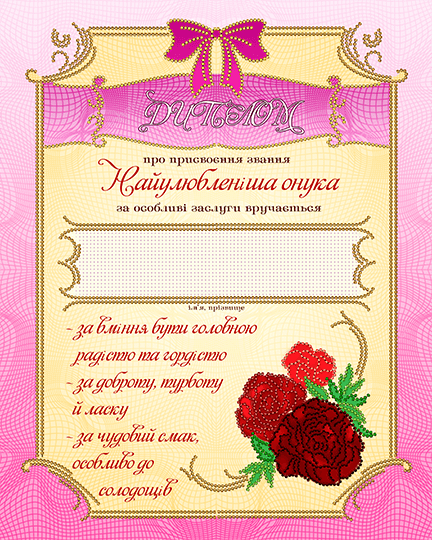 Схема для вышивания бисером Диплом «Найулюбленіша онука» ТМ А-строчка выполнена из плотного атласа с нанесением яркой полноцветной печати высококачественными красками и содержит инструкцию.