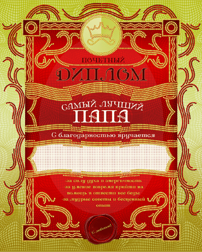 Схема для вышивания бисером Диплом «Самый лучший папа» ТМ А-строчка выполнена из плотного атласа с нанесением яркой полноцветной печати высококачественными красками и содержит инструкцию.